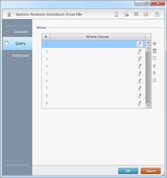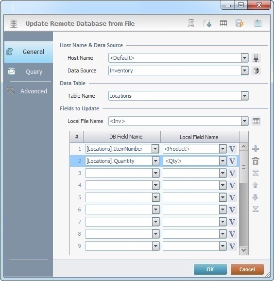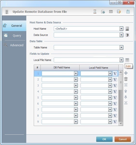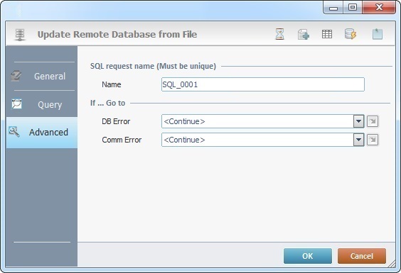 When you add a process, you are required to define its settings. This occurs in the process's properties window which is displayed automatically after having added the Update DB from File process. This properties window includes three tabs - "General", "Query" and "Advanced".