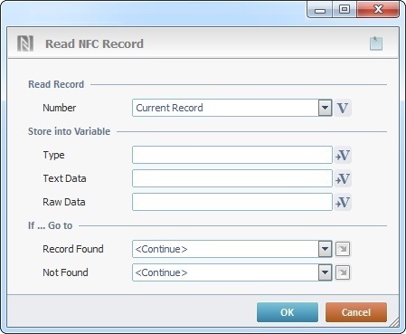 The Read NFC Record process is used to read a specific record in an NFC tag and store that information into variables.
