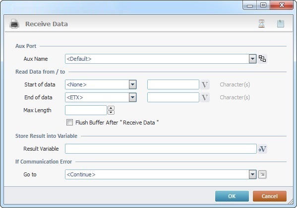 The Receive Data process is used to define the structure of the data (type and receiving variables) to be received through a port, from an auxiliary device.