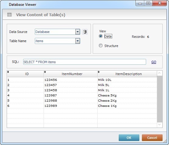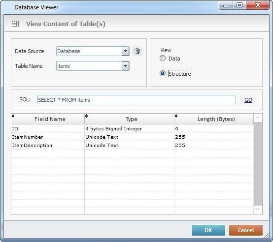 Check one of the available options: Data - displays the content of the selected table. Structure - displays the structure of the selected table. See Detail of a Database Viewer Window below. |