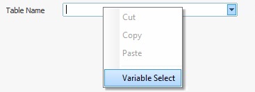 5. If required, you can also define a variable in the related "Table Name" option instead of selecting a table from the drop-down (the list includes the tables from the previously defined data source that have been imported into the project):