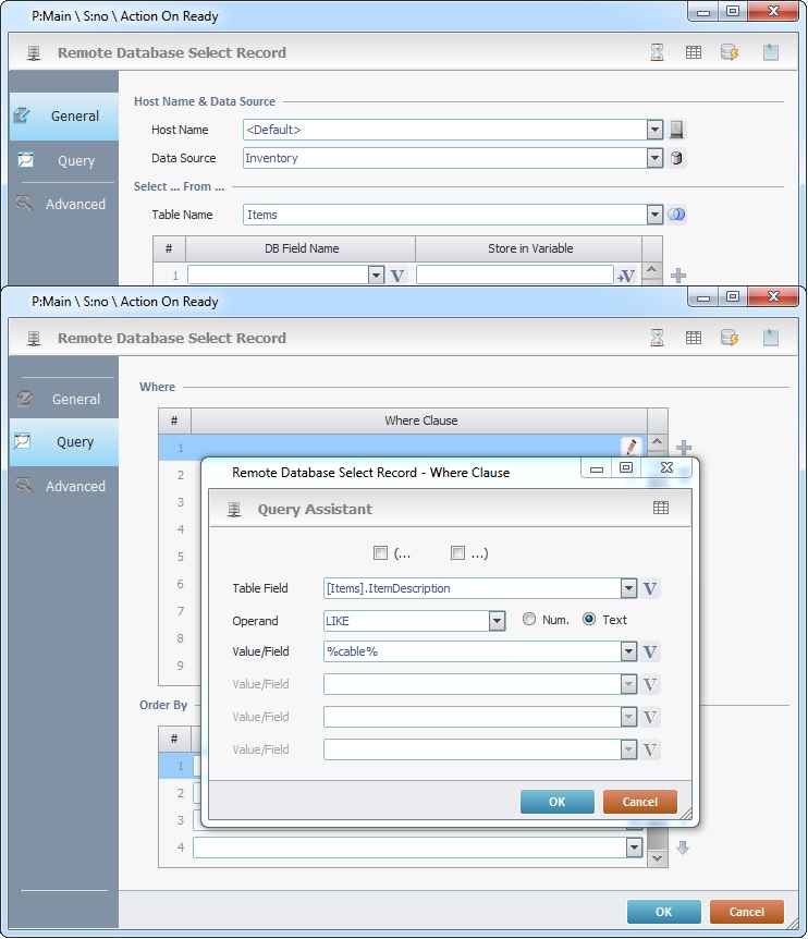 The Remote Database group of processes enables the device to directly exchange data with an SQL database on the host server. Most used SQL transactions can be defined with dedicated processes for SELECT, UPDATE, INSERT and DELETE records. It is also possible to define a free SQL statement that allows you to call stored procedures, functions, complex chained SELECTs, etc.