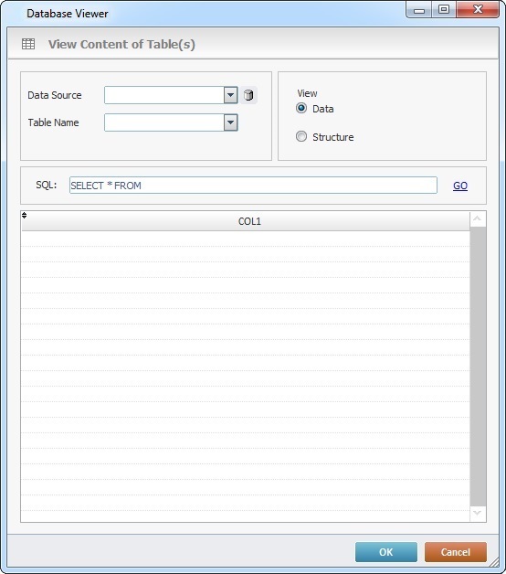 Displays the SQL statement for the selected table (default statement= SELECT * FROM). If you replace the default option with another SQL statement, click the GO button to apply/generate the new statement. |