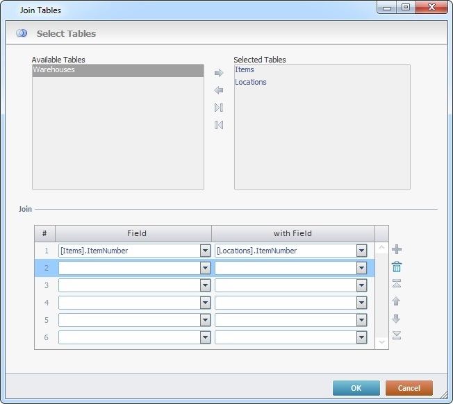 This box displays the available tables to be joined. The required ones must be moved to the box to the right ("Selected Table"). Use the editing icons |