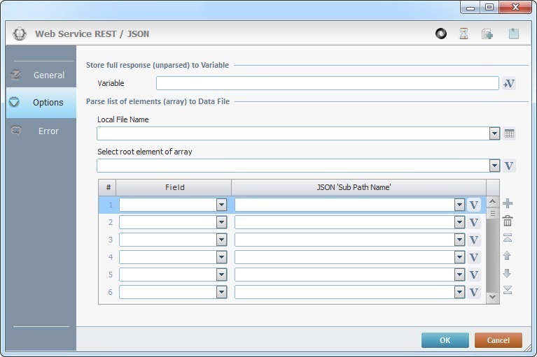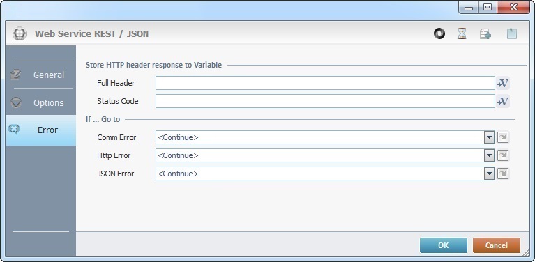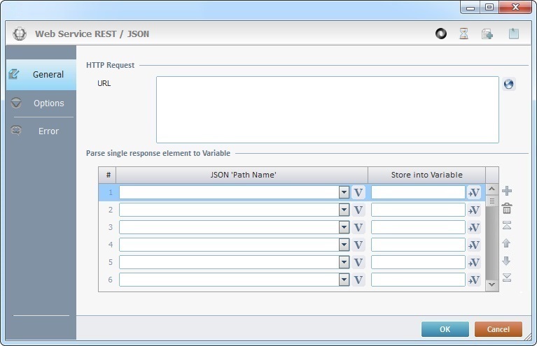 When you add a process, you are required to define its settings. This occurs in the process's properties window which is displayed automatically after having added the REST/JSON process. In this case, the properties window includes three tabs - "General", "Option" and "Error".