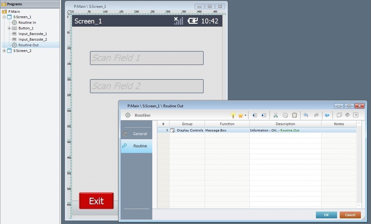"Screen_1" includes 2 Input Barcode controls, an "Exit" Button and a "routine out". The "routine out" consists of a "Message Box" process.