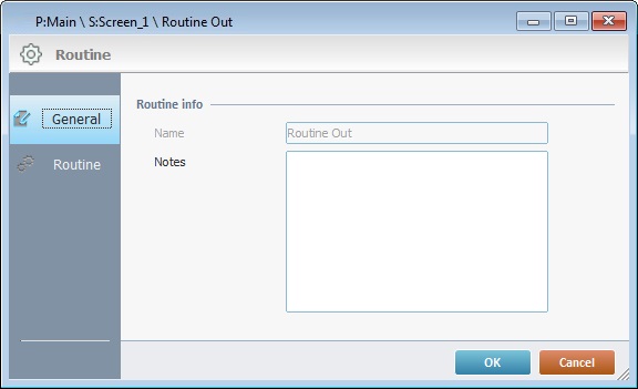 Both options (a. or b.) open a "Routine Out"properties window with the "General" and "Routine" tabs (the "Routine" tab is open by default).