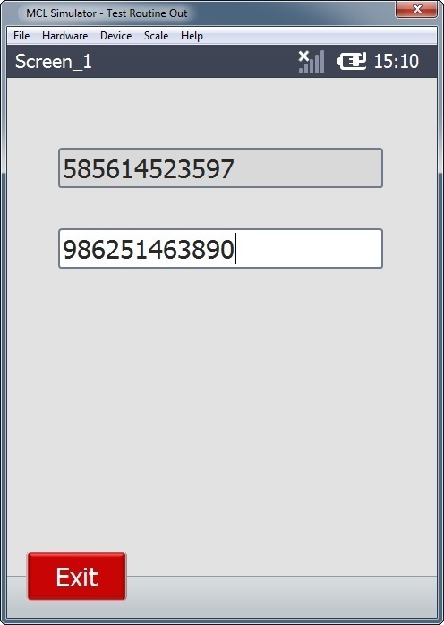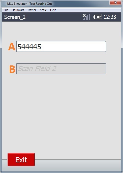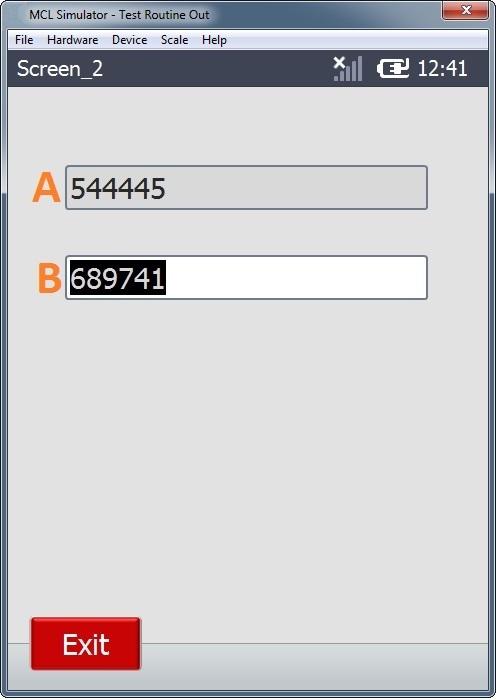 2. The operator performs a scan or types data that is entered in Input Barcode B and presses <ENTER> to validate the input. (The application flow stops, there are no actions to execute. The only available step is to click the "Exit" Button and close the application.)
