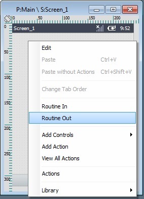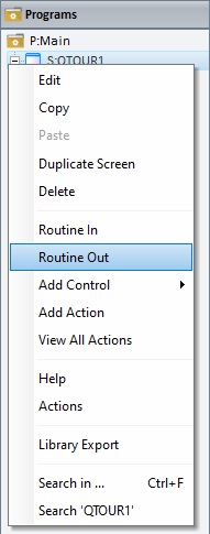 •In the tree view ("Programs" module), right-click the screen you want to add a "routine out" to and select "Routine Out" in the resulting menu.