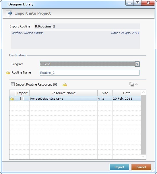 It is possible to add project resources (appended during the routine's export into the "Library" - see To Export a Routine to Library) to the routine's import, even though they are not included in the routine.