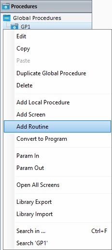 1. Open the "Procedures" module and right-click the global procedure that will include the routine.