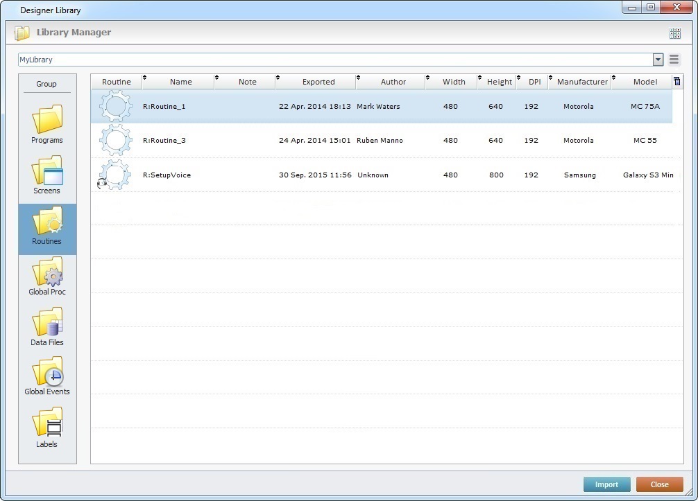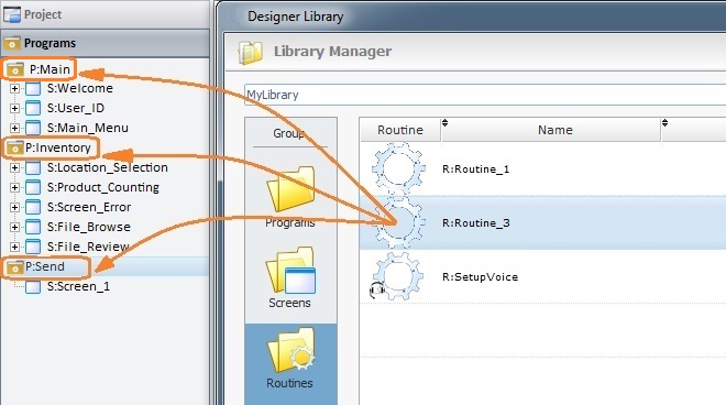 A routine is a reusable element within MCL-Designer V4. This means that a routine created in an MCL-Designer V4 project can be exported into the Library (a folder that stores reusable elements such as screens, programs, data files, etc.) and, then, imported into other projects.