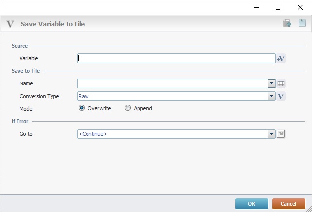Check one of the available modes: "Overwrite" - the content of the source variable will replace the content of the target data file. "Append" - the content of the source variable will be appended to the end of the target data file's content. There will be NO data replacement. |