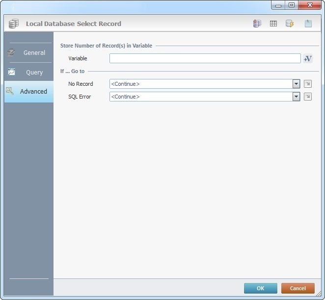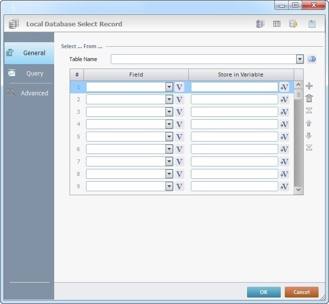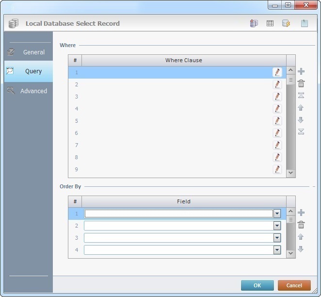 When you add a process, you are required to define its settings. This occurs in the process's properties window which is displayed automatically after having added the Local Database Select Record process. In this case, the properties window includes three tabs - "General", "Query" and "Advanced".