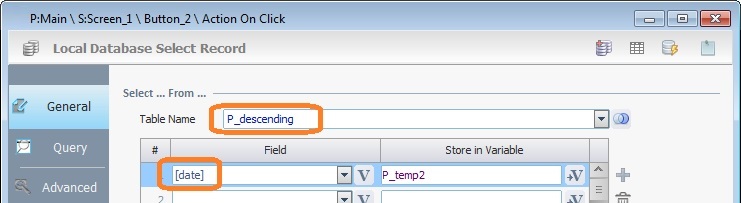 Ex: The table name is defined with the variable "P_descending". The name of the required table field is "date" so the "Field" column was filled in with "[date]". |
