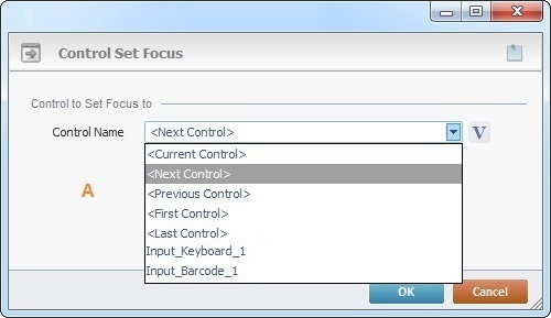 Fill in the option below. The options available in the "Control Name" drop-down list (A) depend on the controls displayed on the screen that includes the process.