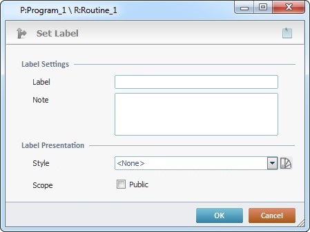 •If a Set Label process is added to a routine, a "routine in" or a "routine out", you can set that label as "public" (it can be called from within that or other routines, as well as from actions) or as "private" (only called from within the routine or "routine in"/"routine out" that includes the label).