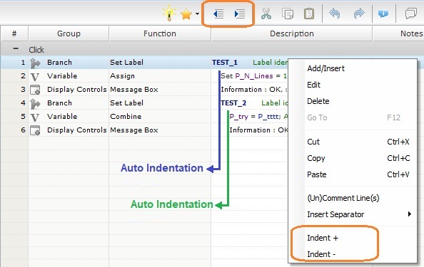 Ex: The image shows the result of the auto-indentation in 2 labels (TEST_1" and "TEST_2") which have different positions and it refers the location of the buttons/options you can use to do a manual indentation.