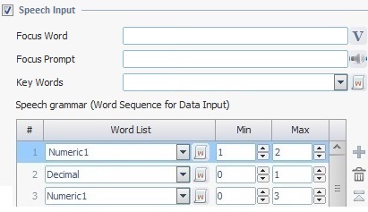 Since this word sequence allows for variable digit input, it is recommended you define a validation word. To do this, select "Global Validation Word" or an app word list that works as a “Validation Word List" in the "End of Input" option. This means that the speech input for this control requires the operator to end with a specific word to validate the value that he said.