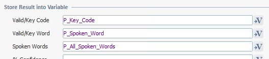 The variable you define here is meant to receive the key codes/key code values associated to the spoken words. It is only applicable if, in the "End of Input" option of the "General" tab, you have selected a specific type of app word list with key codes or if you intend to use keys/key combinations in the "Routing" tab. •In the case of an app word list: There is a type of app word list that can be used to indicate the end of input - this list associates one or more spoken words to a specific set of key codes (<ENTER>, <ENTER1>, <ENTER2>, up to <ENTER9>). Each key code has a default value ("EN", "E1", "E2" up to "E9"). This means that, firstly, any of the listed words can be used to validate the end of input and, secondly, you can,then, use each key code's default value to perform different actions (ex: To redirect the application, depending on the spoken word). The expected variable content will be "EN" for "<ENTER>"; "E1" for "<ENTER1>", "E2" for "<ENTER2>" and so on. See Speech Input Validation Example. •In the case of key codes defined in the "Routing" tab: If you use key/key combinations for routing purposes, the corresponding key code associated to the spoken word will be stored into the variable you select here. Click |