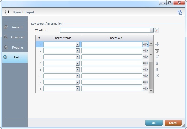This tab allows you to define a "speech help" for the operator - he says specific words/commands that trigger a response from the application (usually instructions to help the operator with his next task).