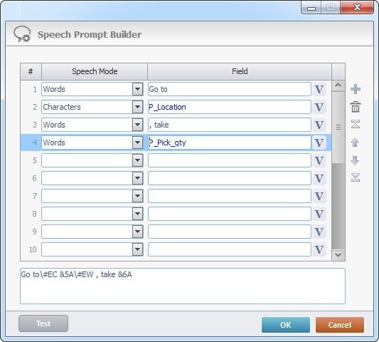 The "Speech Prompt Builder" window contains a table where you can define the speech out prompt: