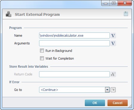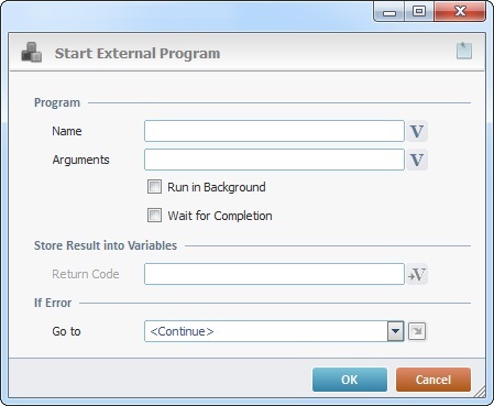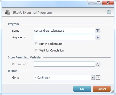 The Start External Program process is used to call a specific external program with arguments (if needed). This process handles external programs, so you must consider the operating system of the current project's target device when using it. Depending on the target device's OS, some of the "Start External Program" settings will be filled in differently (ex: the required identifying elements of the external program being called are different for a Windows and an Android environment).