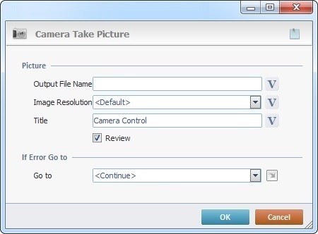 When you add a process, you are required to define its settings. This occurs in the process's properties window which is displayed automatically after having added the Take Picture process.