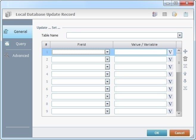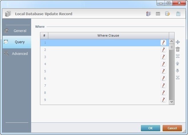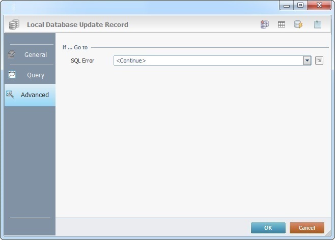 When you add a process, you are required to define its settings. This occurs in the process's properties window which is displayed automatically after having added the Local Database Update Record process. This properties window includes three tabs - "General", "Query" and "Advanced".