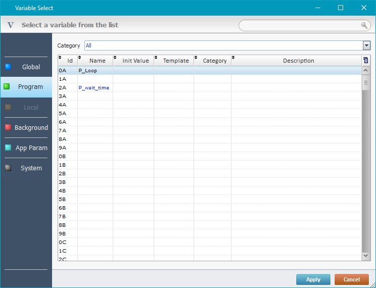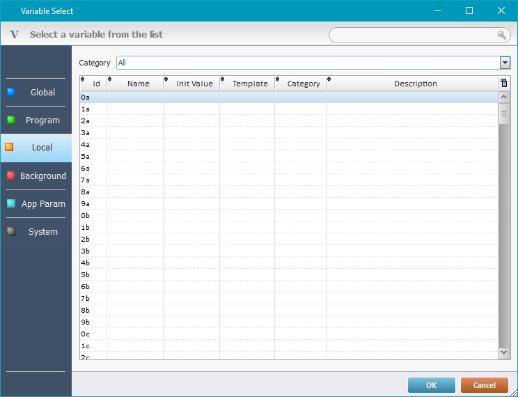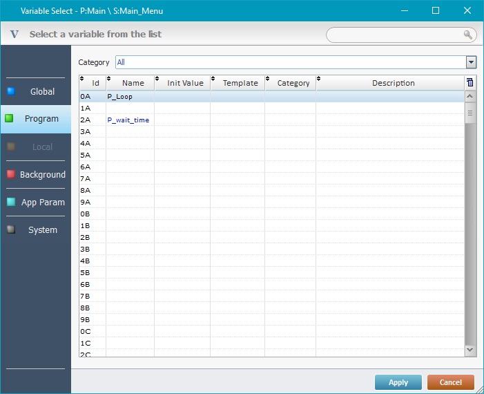 •A floating "Variable Select" window displays the variables that are compatible with the current context, the variables can be written in or read.