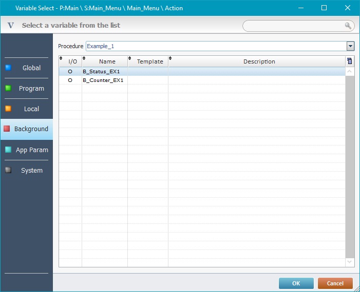 ▪Background variables that represent input values for the execution of the background procedure (created in its "Input" tab) are identified with an "I";
