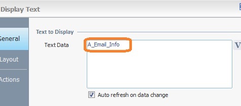 The "A_Email_Info" variable is referenced in a "Display Text" control. |