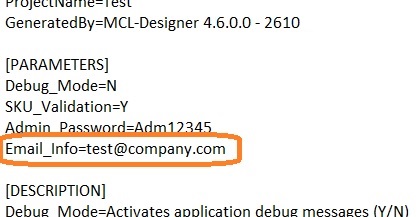 [PARAMETERS] Debug_Mode=N SKU_Validation=Y Admin_Password=Adm12345 Email_Info=test@company.com