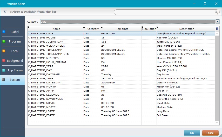 The System Variables are not defined by the user. They contain system information that can be used by the programs in the application. System variables contain information such as current date & time, selected record number in a file browse control, battery level, program name and version. System variables are grouped in “Audio”; “Camera”, “Date”, “Device”, “GPS”, “Imager”, "RFID"; “Network”; "App_Info", “System”, "Timer", "Operator", "Navigation", "Voice", "Special" and "NFC" variables.