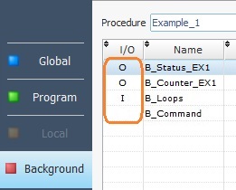 Ex: The variables "B_Status_EX1" and "B_Counter_EX1" store output values; "B_Loops" stores input values and "B_Command" is meant for another value.