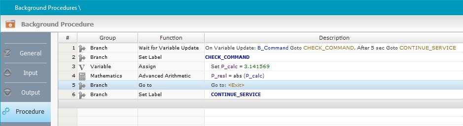 In this example, the background procedure waits 5 seconds for the background variable "B_Command" to be updated (by the main thread), meaning, the background procedure's workflow is interrupted for 5 seconds (defined time out). If the background variable"B_Command" is updated during this time period, the flow will proceed to the "CHECK_COMMAND" label. If the background variable"B_Command" is NOT updated during these 5 seconds, a new iteration of the service is executed in the "CONTINUE_SERVICE" label.