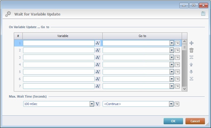 Define how long to wait for the variable update. Select an entry from the drop-down OR click This drop-down is only active after the option "On Time Out Go to" is checked. |