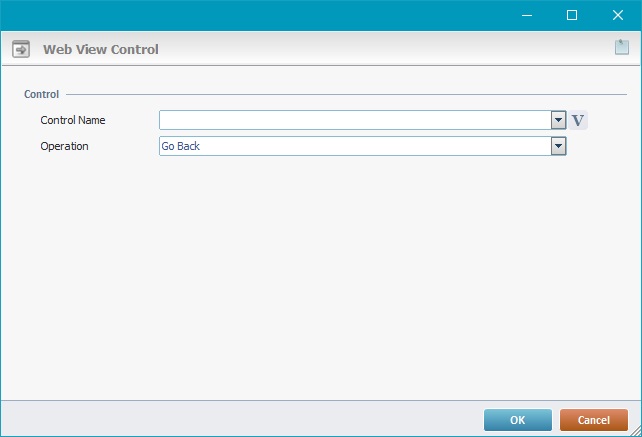 Select the operation to be executed by the defined Web View control from the drop-down: "Go Back"; "Go Forward"; "Reload"; "Zoom In"; "Zoom Out", "Show Zoom Assistant"; "Page Up"; "Page Down"; "Go to Top of Page"; "Go to Bottom of Page" or "Find Text". |