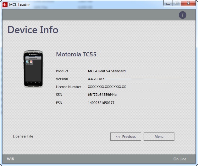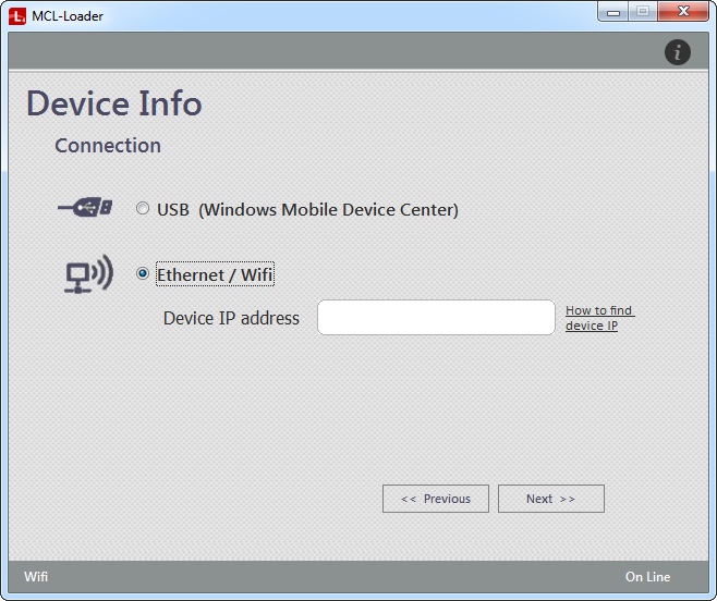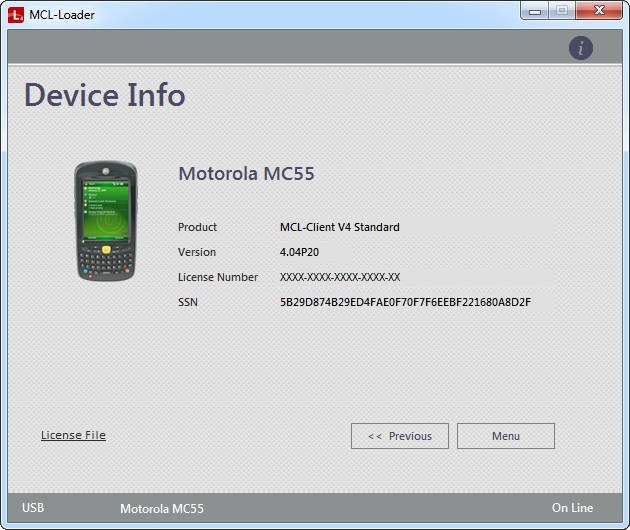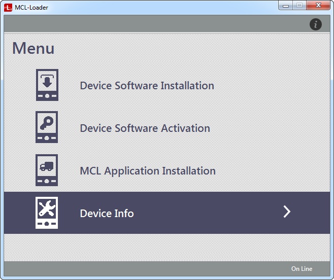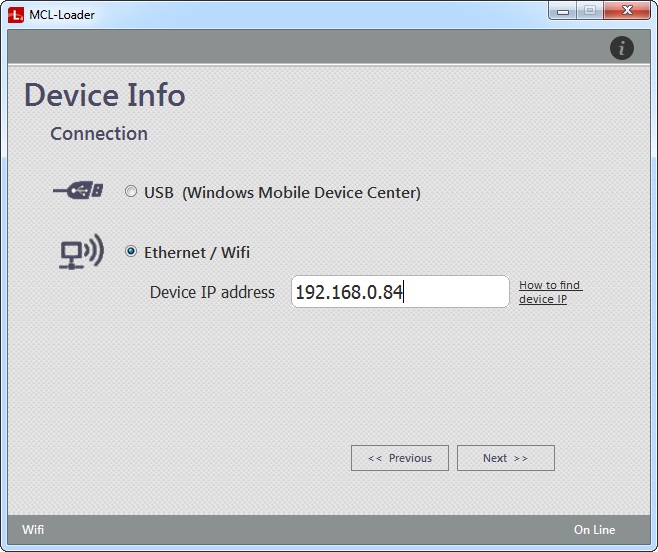 MCL-Loader V4 provides you with information regarding the device you have connected to your PC (via USB/Windows Mobile Device Center or Wifi) and the installed MCL software.