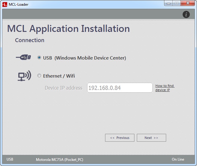 Make sure that your device is connected to the PC where MCL-Loader V4 is installed (via USB for Windows Mobile/Windows CE devices/via Wifi for Windows Mobile/Windows CE and Android devices)